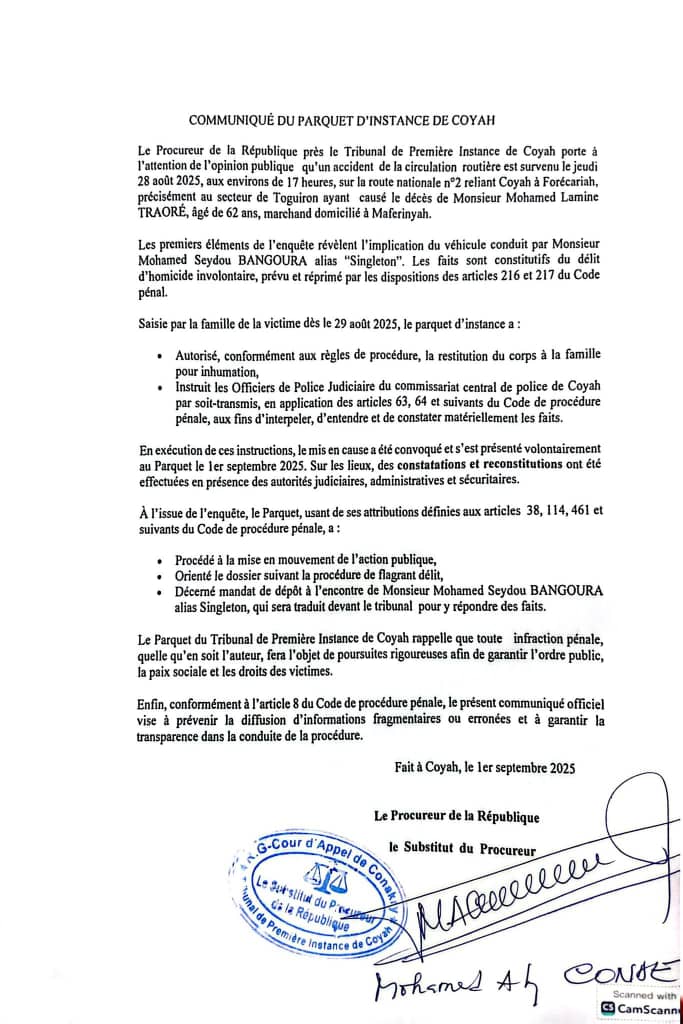 Le parquet près le tribunal de première instance de Dixinn a confirmé ce mercredi 29 octobre 2025, dans un communiqué...