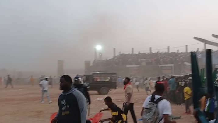 Dans une débandade totale, des jets de pierre ont commencé un peu partout au stade et même en dehors du stade. Pour rétablir l’ordre, les forces de l’ordre ont fait usage de gaz lacrymogènes. Chacun voulant se chercher, des bousculades ont commencé à la grande porte ainsi qu’à la petite porte. Sous l’effet des gaz lacrymogènes, plusieurs personnes se sont évanouies, les enfants et plusieurs jeunes filles sont tombées, par manque de secouristes, les personnes tombées n’ont pas pu être sauvées. Chose qui a été à l’origine de plusieurs morts, il ya eu également plusieurs dizaines de blessés, parmi eux, ceux qui ont escaladé le mur.