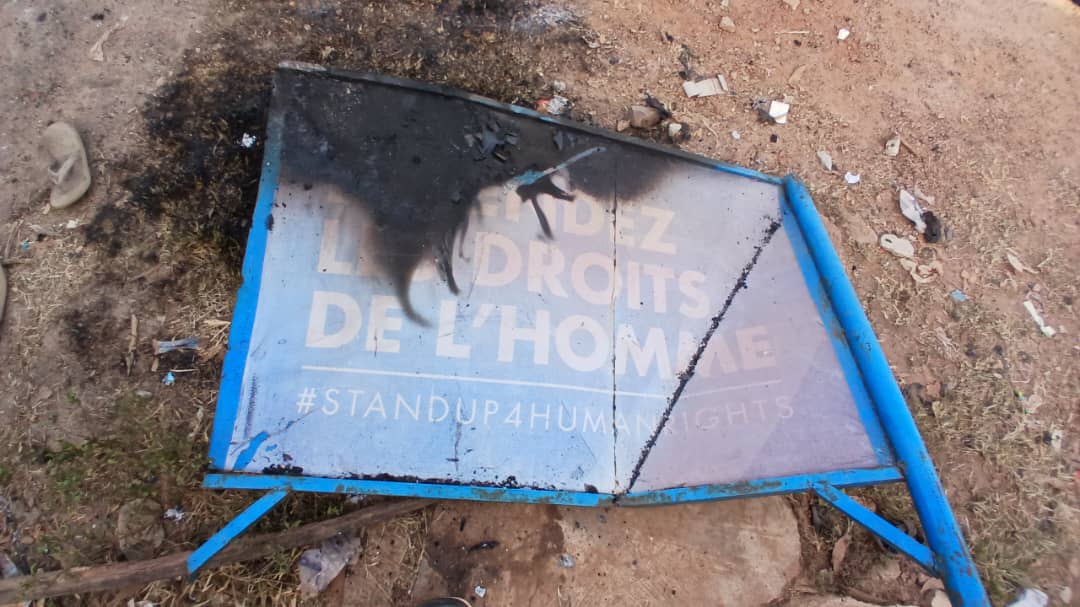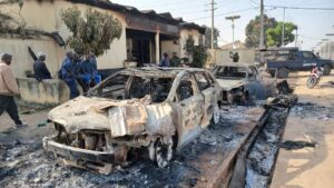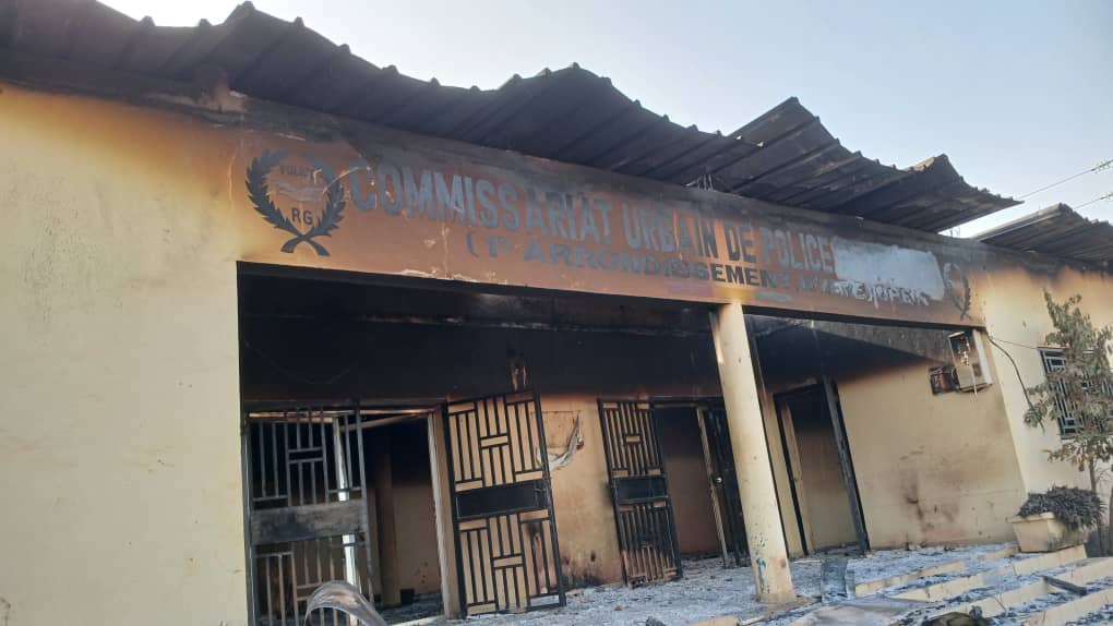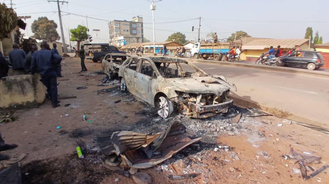 Pendant ce temps, les jeunes en colère étaient en train de brûler certains véhicules se trouvant aux alentours du stade, 3 véhicules floqués des photos du Chef de l’État ont été incendiés, un devant le stade et 2 autres en face du Commissariat urbain qui a lui aussi été incendié.