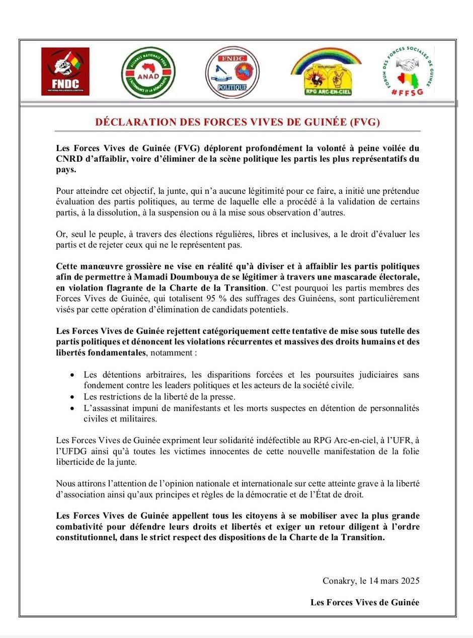 Les Forces Vives de Guinée (FVG) contestent les résultats de l’évaluation des partis politiques initiée par le Ministère de l’Administration du Territoire et de la Décentralisation (MATD). Dans une déclaration publiée ce samedi 15 mars 2025, elles estiment que cette initiative n’a d’autre but que d’affaiblir l’opposition et de préparer des élections biaisées.
