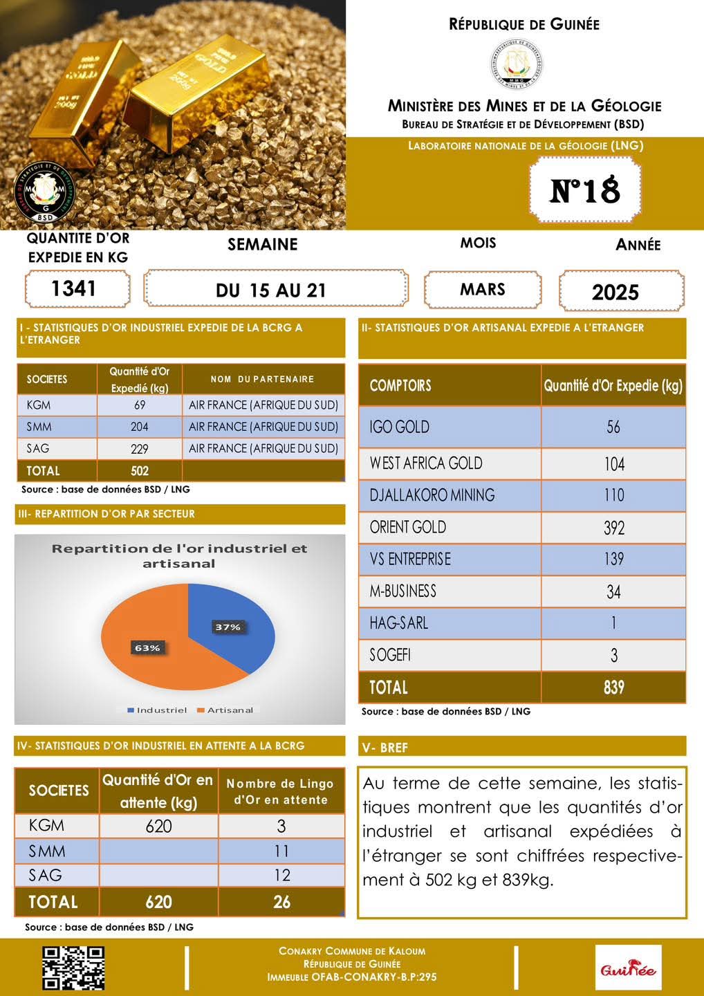Pour l’Or, les statistiques montrent que les quantités d’or industriel et artisanal expédiées à l’étranger se sont chiffrées respectivement à 502 kg et 839 kg