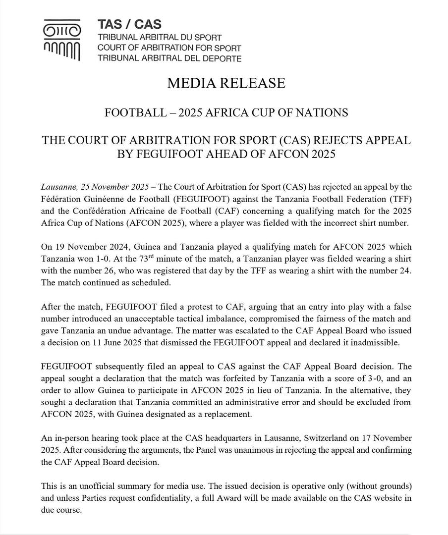 Litige Tanzanie-Guinée : le Tribunal Arbitral du Sport rejette l’appel de la FEGUIFOOT