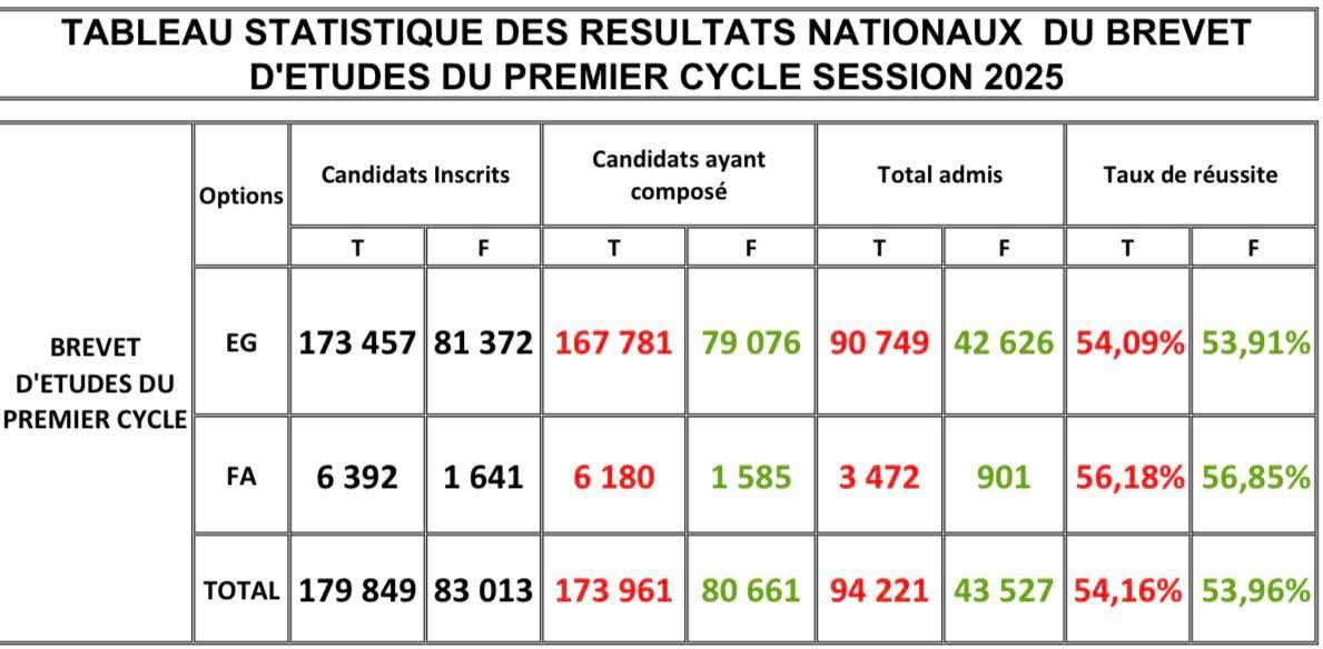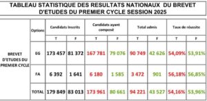 Après la proclamation des résultats du Certificat d’Études Élémentaires (CEE), le ministère de l’Enseignement pré-universitaire et de l’Alphabétisation a publié les résultats nationaux du Brevet d’Études du Premier Cycle (BEPC), session 2025 ce jeudi 17 juillet 2025. Sur 262 862 candidats inscrits, 254 622 ont effectivement composé. Au total, 137 748 ont été admis, soit un taux de réussite national de 54,16 %.