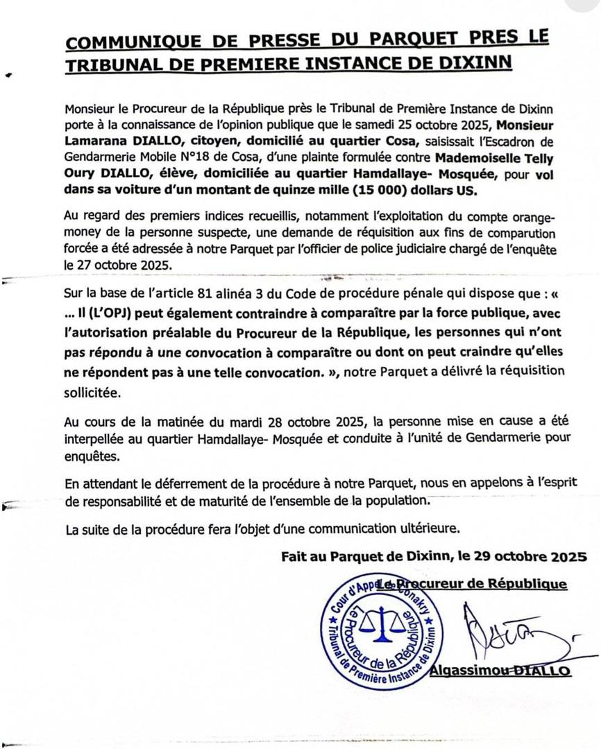 Le parquet près le tribunal de première instance de Dixinn a confirmé ce mercredi 29 octobre 2025, dans un communiqué officiel, l’interpellation de Mademoiselle Tély Oury Diallo, élève domiciliée à Hamdallaye-Mosquée, dans le cadre d’une enquête pour vol présumé de 15 000 dollars américains.