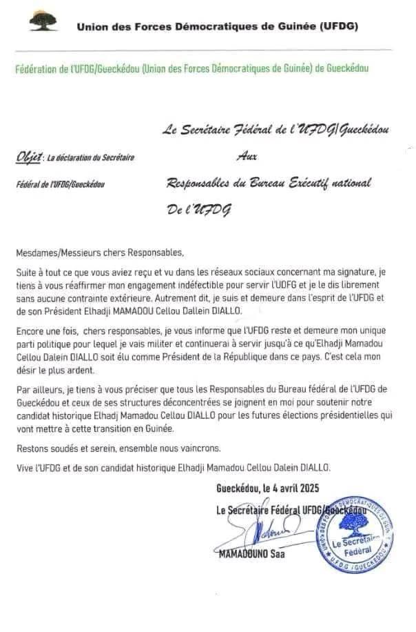 Des responsables fédéraux de l’UFDG ont pris leurs distances avec un mémorandum daté du 3 avril 2025, signé par des secrétaires fédéraux de la Haute Guinée et de la Guinée Forestière. Le document, présenté comme un appel à l’unité, proposait la réintégration des membres exclus du parti. En réaction, plusieurs cadres ont réaffirmé leur attachement à la ligne actuelle de l’UFDG et à son président, Elhadj Cellou Dalein Diallo.